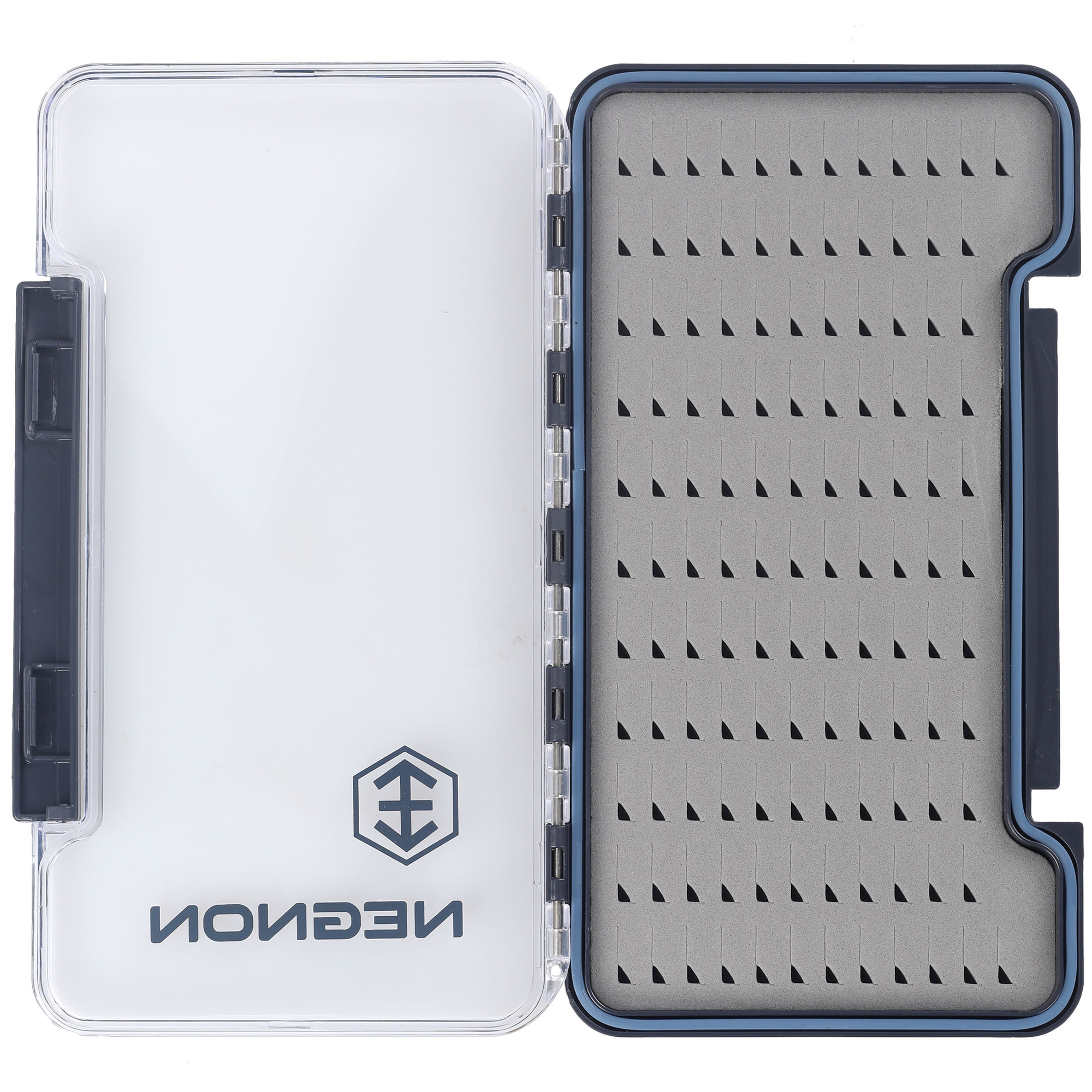 Negnon View Slim Fly Box - Large is an elegant and functional box for nymphs and streamers. The transparent housing allows for a quick view of the contents without the need to open the box. A sturdy hinge and closure ensure durability and reliability. Thanks to the gasket, the box is waterproof when closed. Inside, there is a foam insert for pinning flies (available with cutouts in various variants), compartments for small items, or a combination of foam and compartments. Choose the variant that best suits your needs.